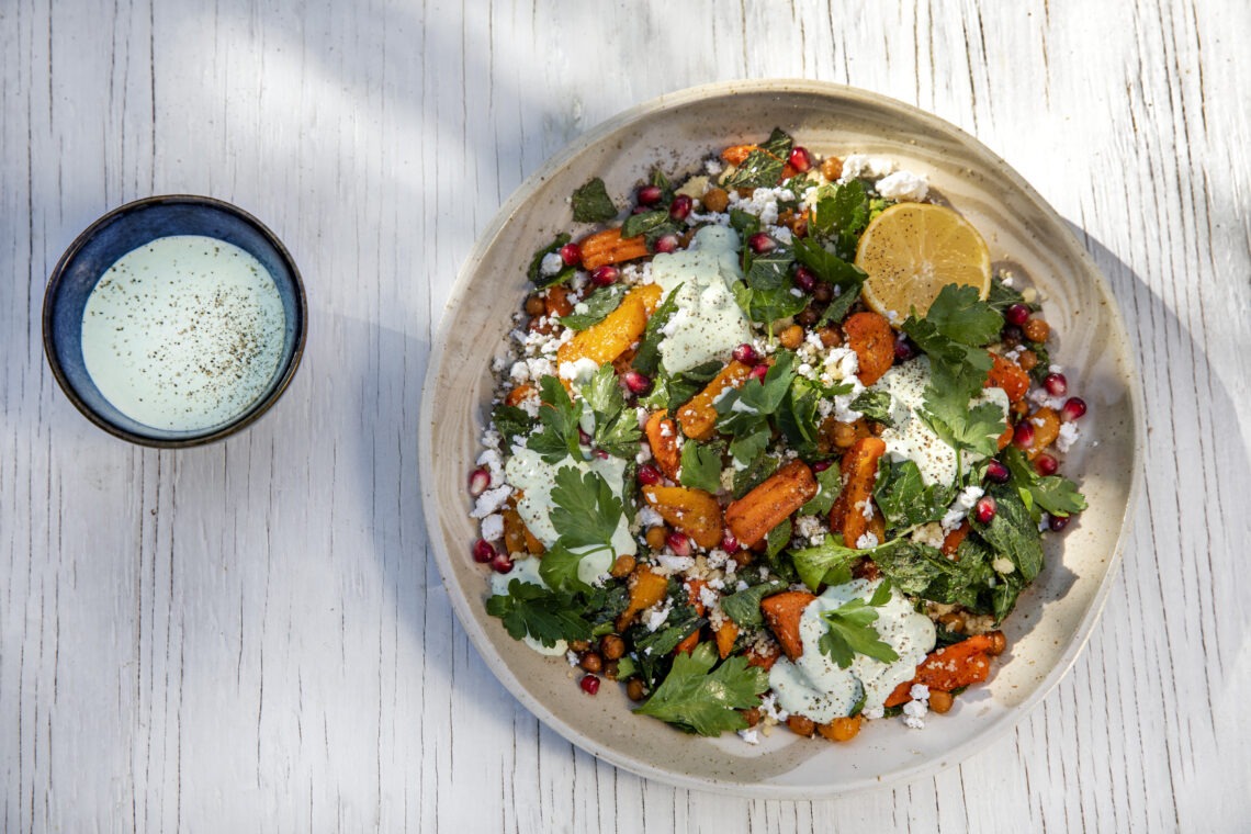 Honung- och harissarostad morot med kikärter, grön fetayoghurt, couscous och örter