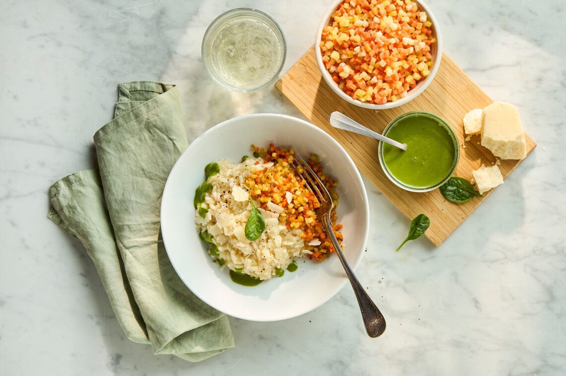 Fördela den varma risotton i tallrikar, toppa med frästa brunoisegrönsaker.