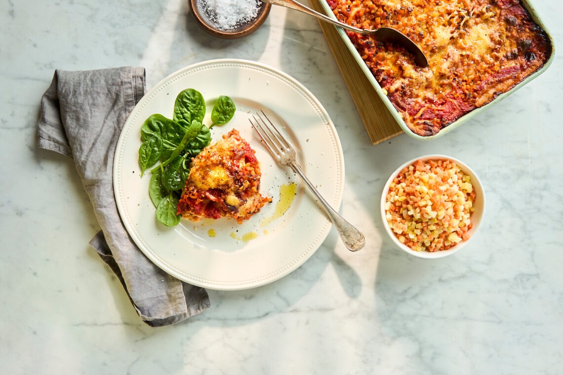 Täck botten på ugnsformen med ett lager tomatsås. Varva lasagneplattor med fyllning, bechamelsås och tomatsås. Upprepa proceduren och avsluta med bechamel och brunoisegrönsaker på toppen samt riven ost.