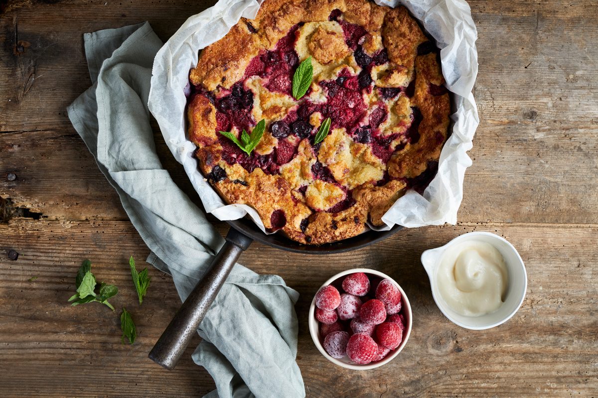 Sprød bærtærte med jordbær, hindbær og kirsebær. Serveres med en dejlig friskpisket vaniljecreme. Opskriften er udviklet af Louise Bondebjer.