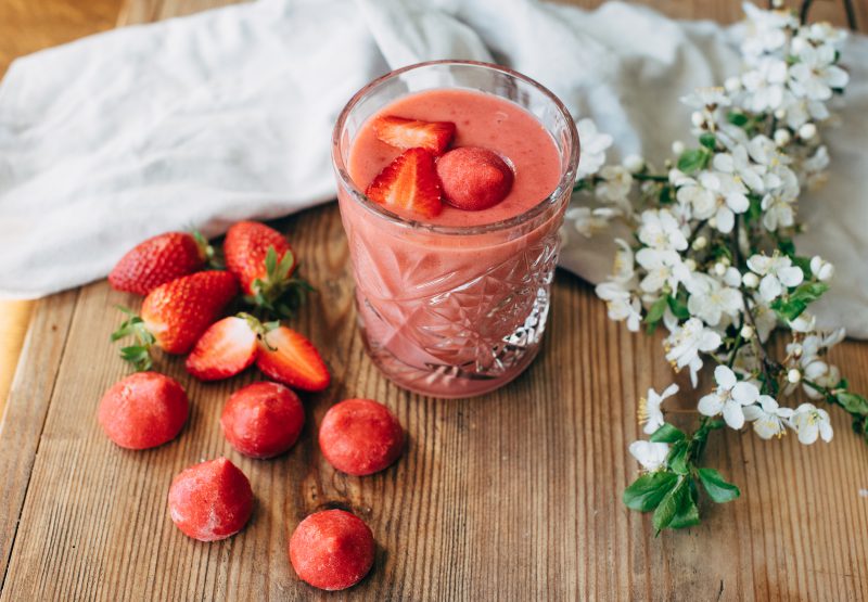 En vidunderlig sommerlig og økologisk jordbær smoothie ?? lavet af Magnihills jordbær puree. (vare.nr: 33648)