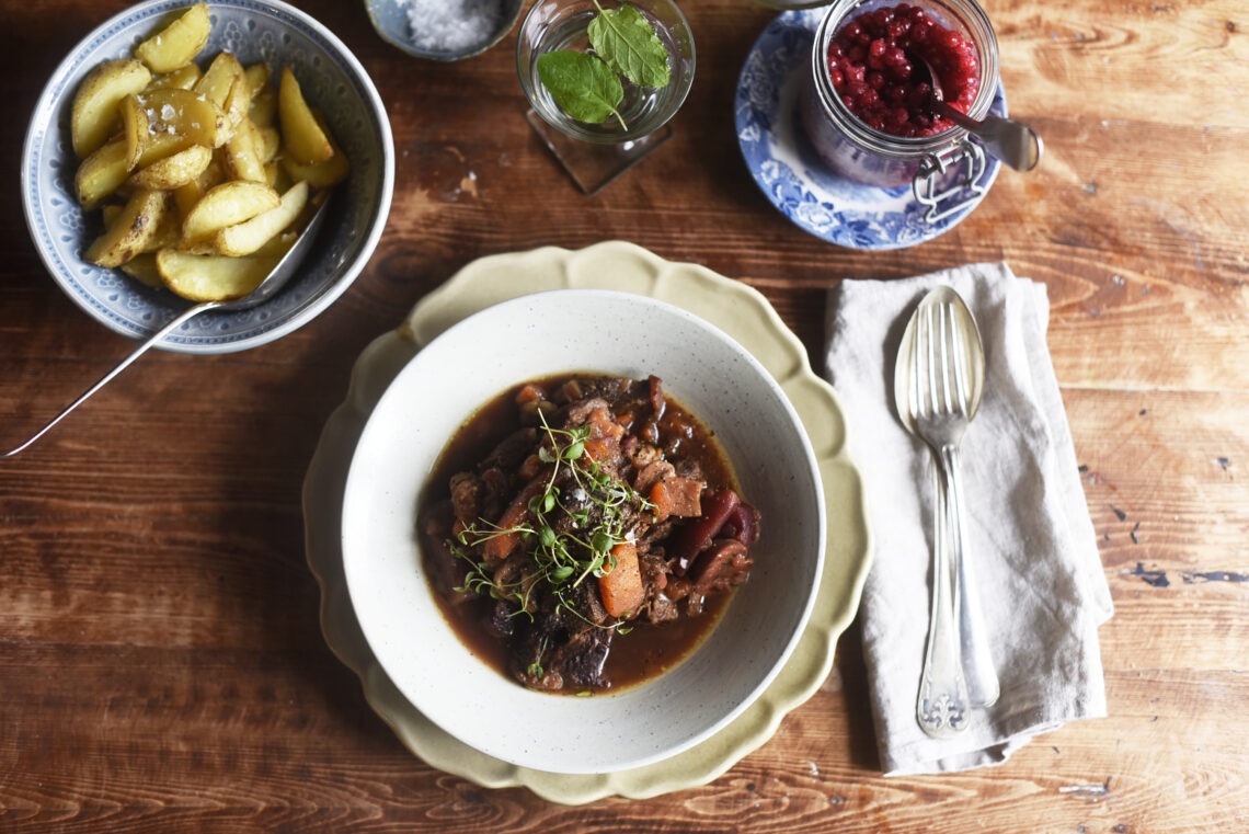 Server den varme oksegryde med frisk timian, ristede kartoffelbåde og tyttebær.