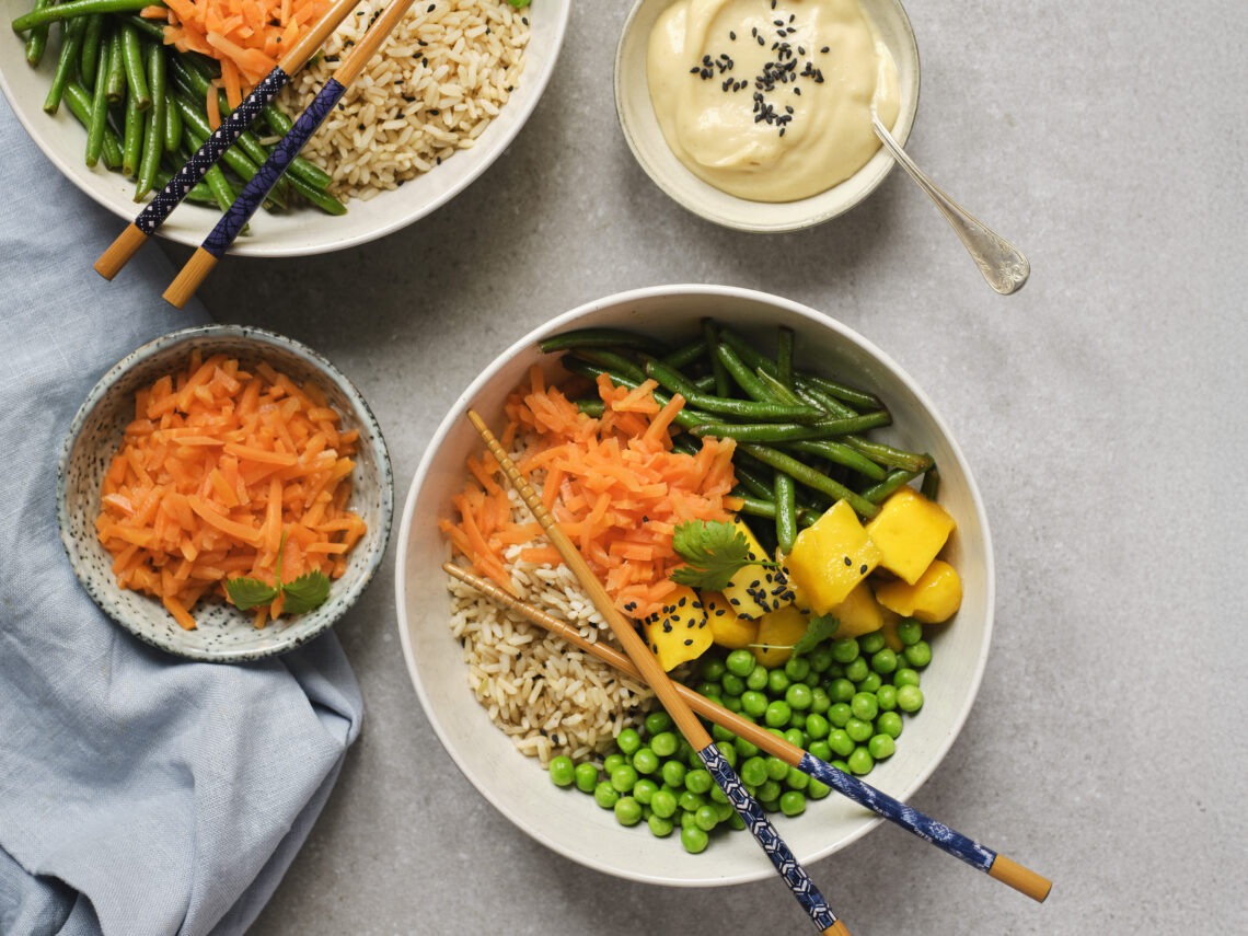 Ved servering: Anret brune ris, ærter, mango og haricots verts i skåle, og top med syltede gulerødder og soyamayonnaise. Drys sorte sesamfrø på toppen.