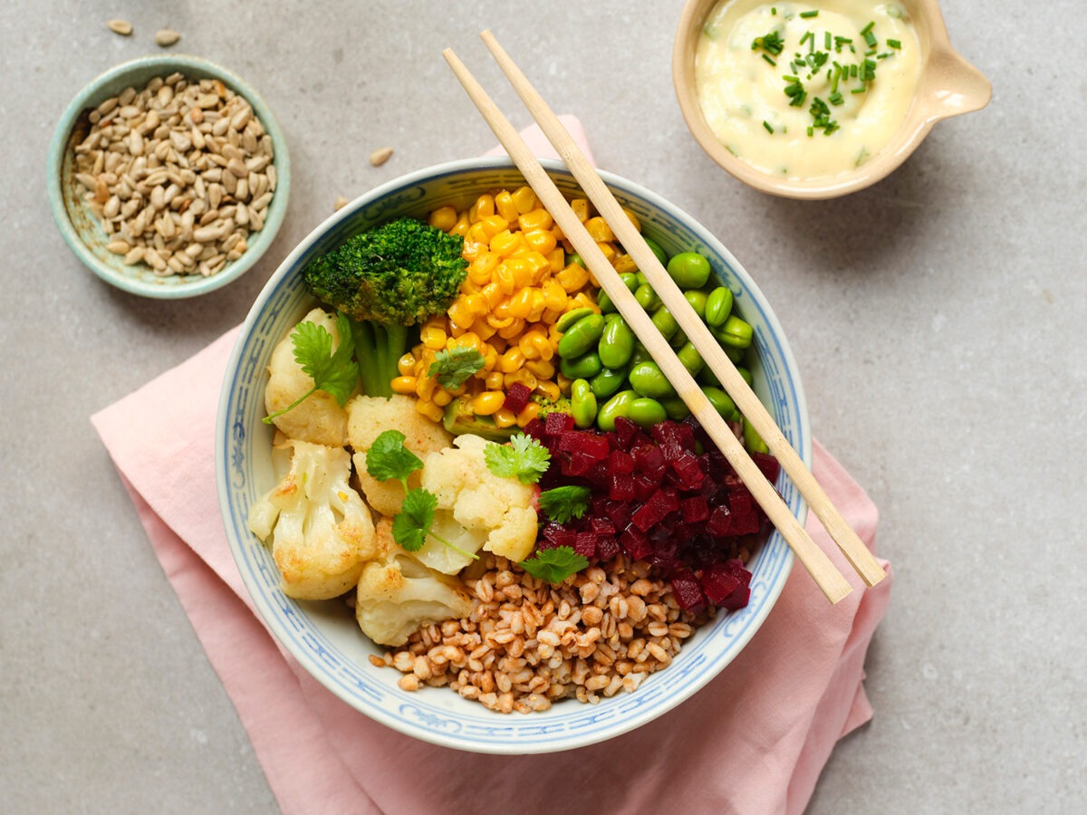 Ved servering: Læg hvedekerner, broccoli og blomkål, sojabønner kerner og majs i en dyb skål. Top med syltede rødbedetern,