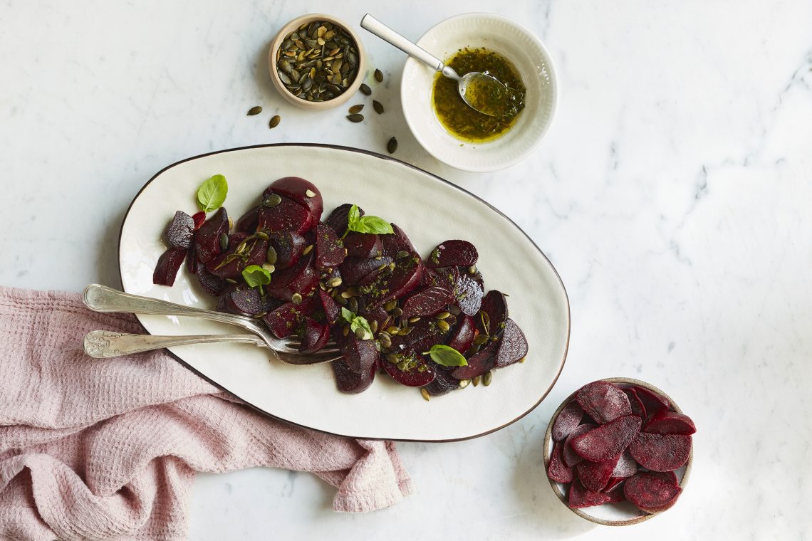 Anret de varme ovnbagte rødbeder på et fad, dryp med dildolien og drys græskarkernerne på toppen.