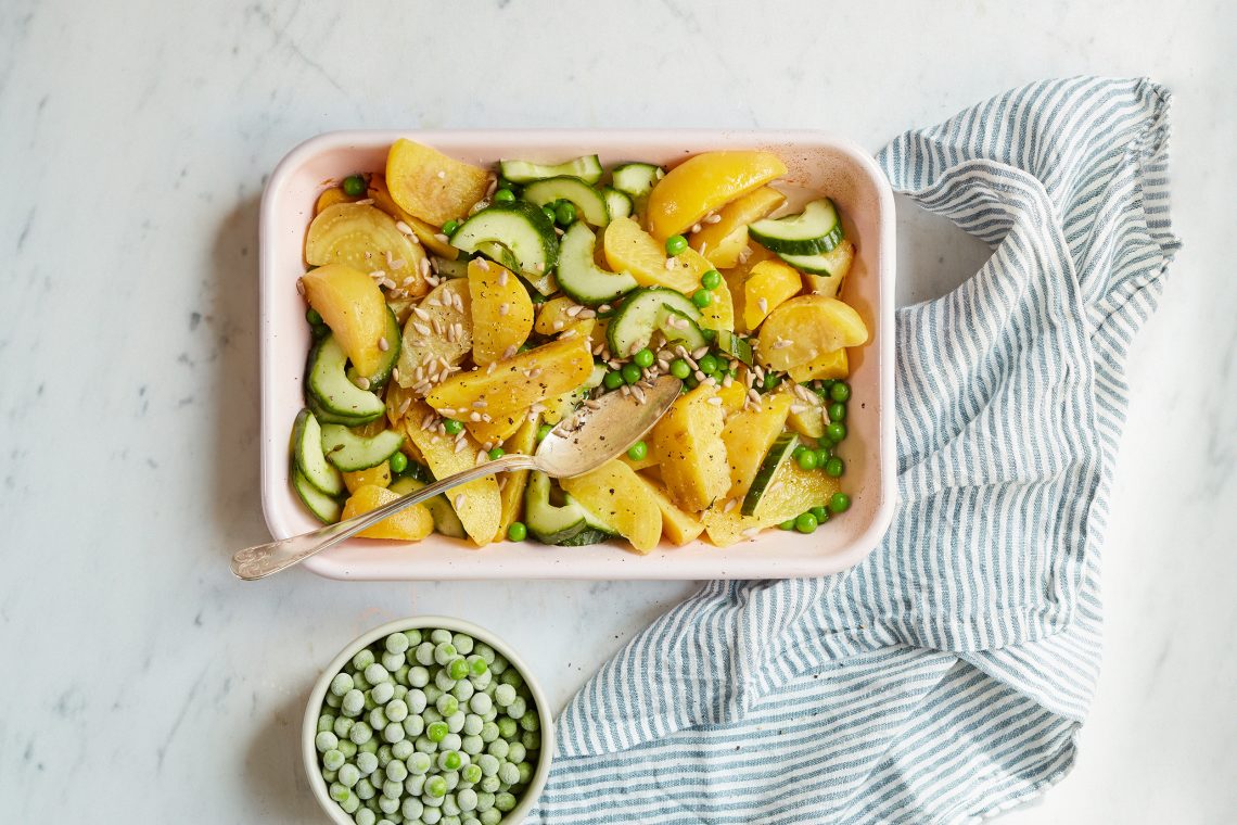 Smag til med salt og peber. Servér de varme ovnbagte gule beder på et fad med grønne ærter, agurk i skiver og dryp med citronolie. Pynt med solsikkekerner!