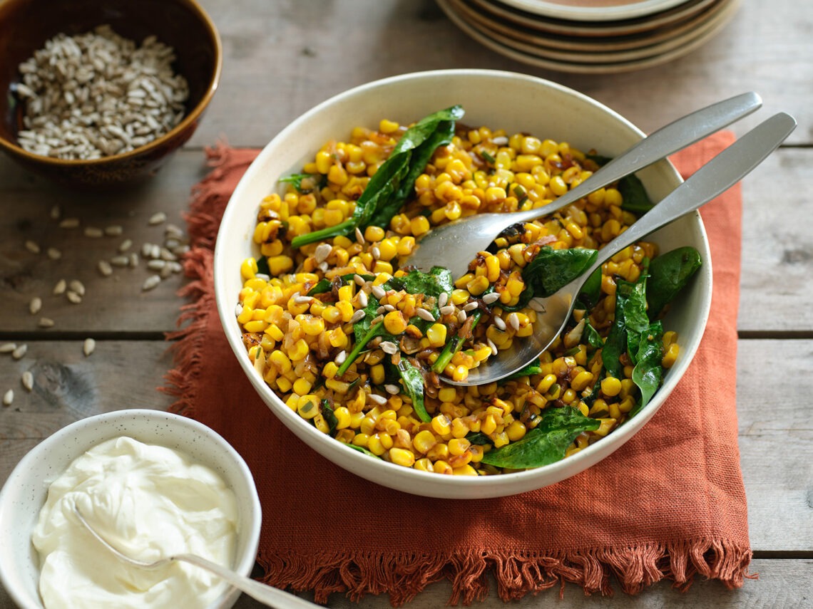 Server den varme majssalat på et fad eller skål med de ristede solsikkekerner og hvidløgscremefraiche.